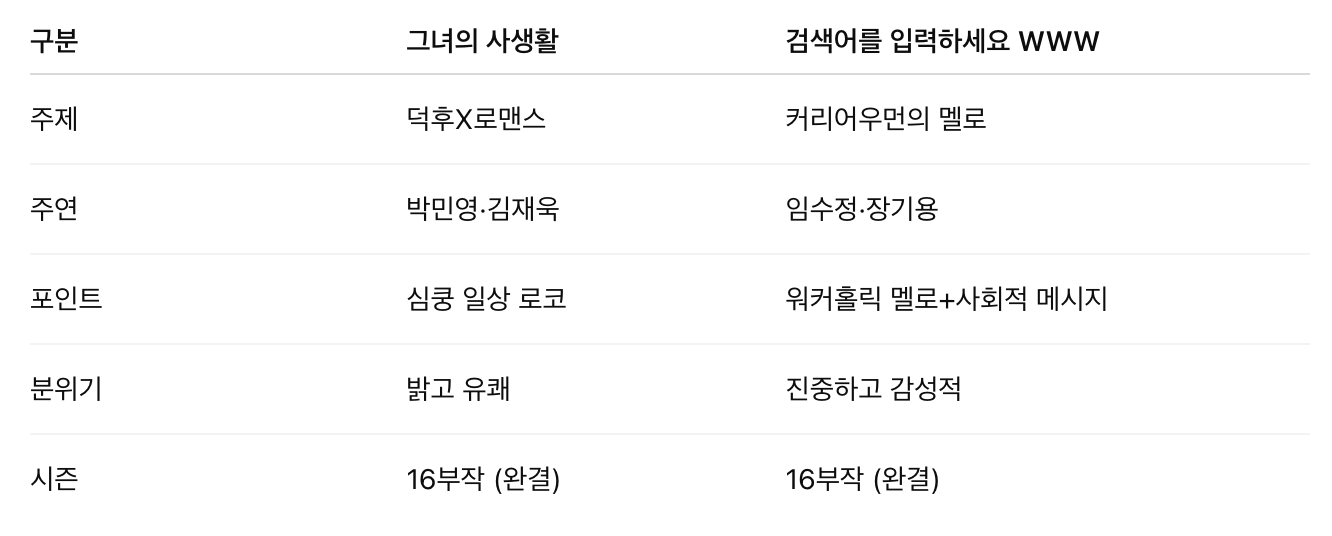 두 드라마 모두 2019년 tvN 수목드라마의 명성을 이끈 작품들입니다. 코믹한 로맨스를 원한다면 <그녀의 사생활>, 더 깊은 여운의 멜로를 원한다면 <검색어를 입력하세요 WWW>가 제격입니다.