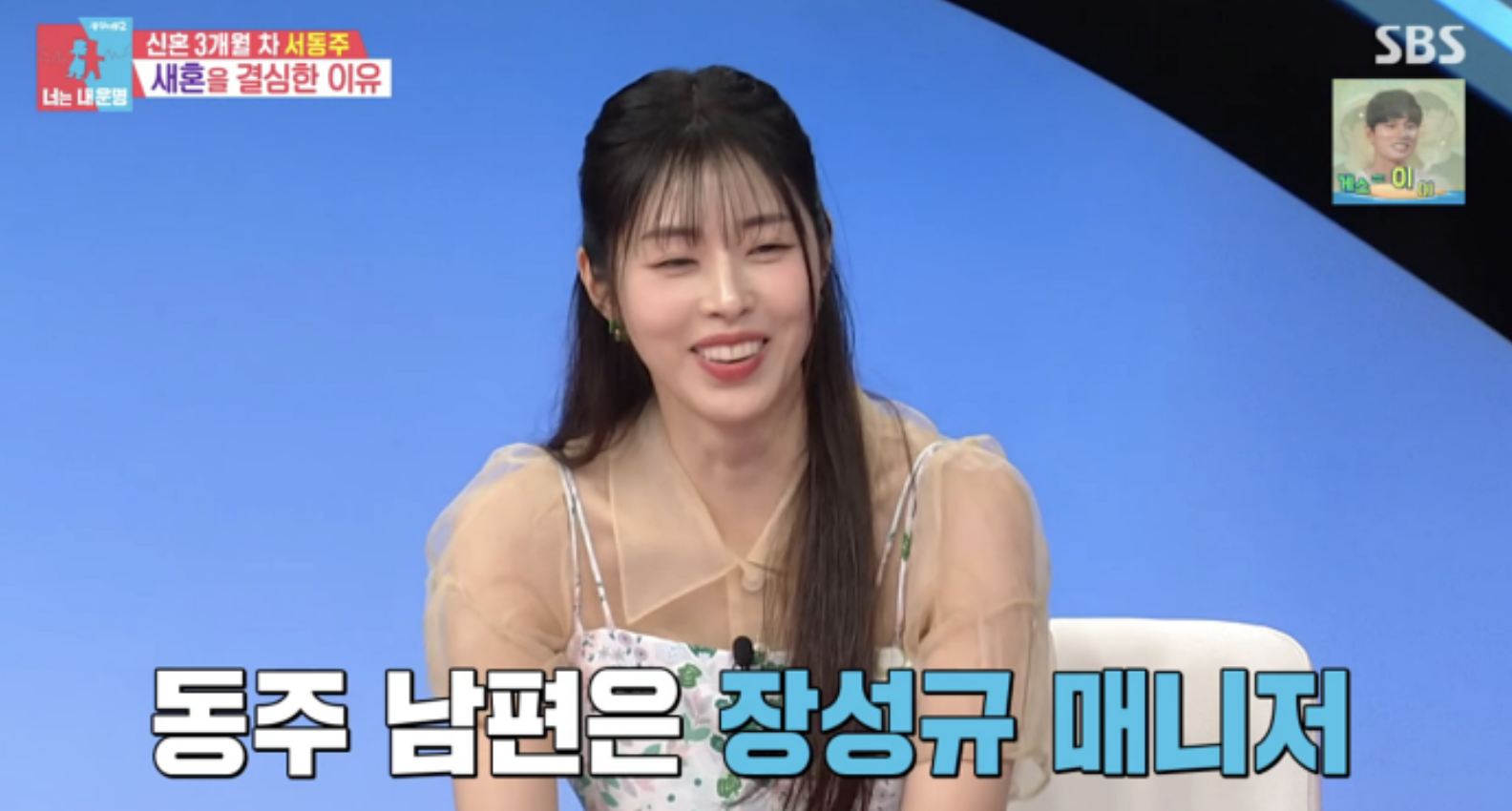 서동주는 남편이 방송인 장성규의 매니저라고 밝히며 “장성규 씨가 주선을 한 건 아니고, 또래 지인들 모임에서 처음 만났다”고 설명했습니다.